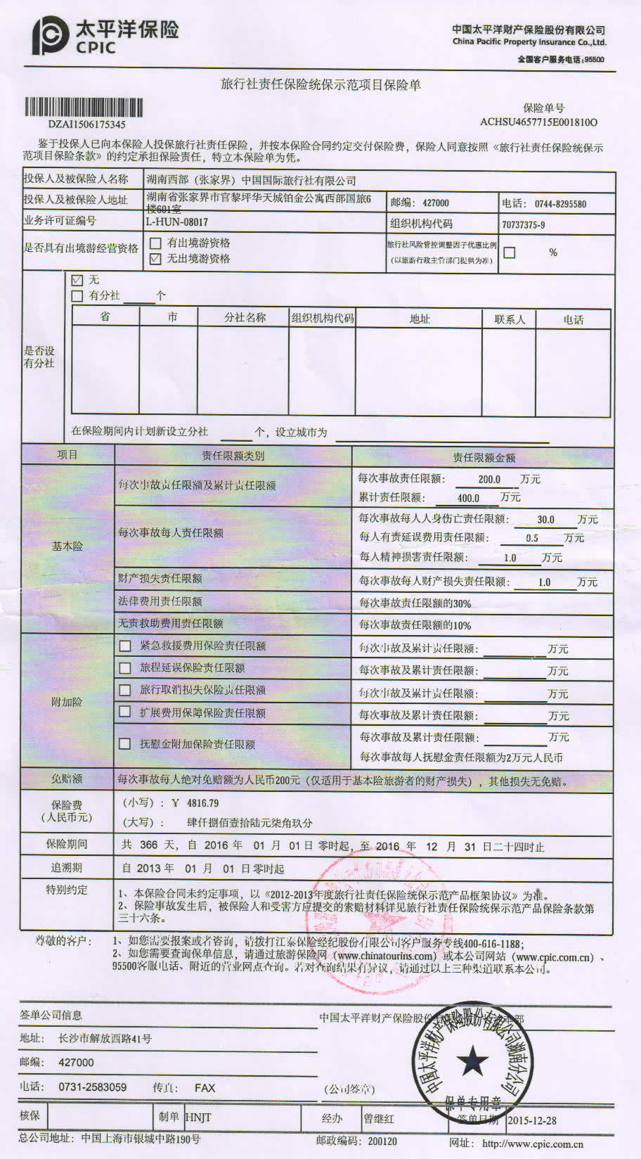 旅行社保險(xiǎn)單