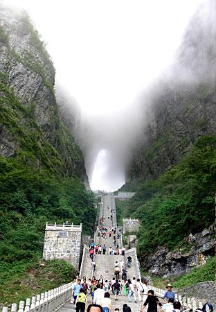 選擇乘索道游覽天門山是最佳視角。索道吊廂一出站房,馬上就騰空飛了起來,從城市的一棟棟樓頂掠過,猶如在城市上空滑翔。翻過一道山梁之后,城市被遠(yuǎn)遠(yuǎn)拋在了視線以外,大片翠綠的稻田映入眼簾,透過打開的通風(fēng)窗口,一陣陣青草水田特有的清香沁入心脾。或高或低的農(nóng)舍不時從我們身下滑過,牛羊們?nèi)齼蓛捎崎e的在田間浮動著,靜謐、安詳。再翻過一座山峰,我們便立即被滿山的青翠所包圍,萬仞絕壁也已投懷送抱。索道支架矗立于絕壁天險(xiǎn)中,或挺立或傾倒或探頭或擁抱,我們繼續(xù)在艱險(xiǎn)中游歷,時而隱沒于云堆,時而出世于蒼穹。這時你除了那滿懷的驚險(xiǎn)刺激外有的便只有望索而興嘆了。我拍了很多片子,但是總覺得還是沒有足以記錄下來這座空中盆景的壯麗。