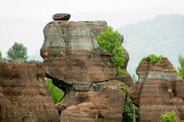紅石林 告別船工后一切便突然安靜下來(lái),過(guò)山谷的小路沒(méi)有人家,偶爾傳來(lái)幾聲清脆的鳥(niǎo)叫。穿過(guò)幾座隘口,峰回路轉(zhuǎn)后“石林”漸漸露臉,石頭的顏色是由灰白到棕紅,變幻而又使人聯(lián)想。間或一棵參天大樹(shù),或是綠竹三兩棵,則又是另一番景致了。于高于低、于肥于瘦的石林,于石于樹(shù)、于濃于淡的色彩,顯得雄奇又雋秀,并透露出一種清靈飄逸。 這些石柱不但顏色各異,而且大小不等。有的高達(dá)七、八米,而有些則像半埋于地下的巨獸骨架。一位村民告訴記者,現(xiàn)在石林沒(méi)有以前壯觀(guān),都長(zhǎng)渣子(灌木)了。原因是由于山頂樹(shù)木減少,雨水將泥土帶下山,很多石頭都被埋在土下,后來(lái)這些地方都開(kāi)墾了農(nóng)田,石林也被永久覆蓋。 由于泥土覆蓋,石林被切割成一個(gè)個(gè)小區(qū)域,有些隱蔽在果林中,而有些則像突然從天而降,散落田間。