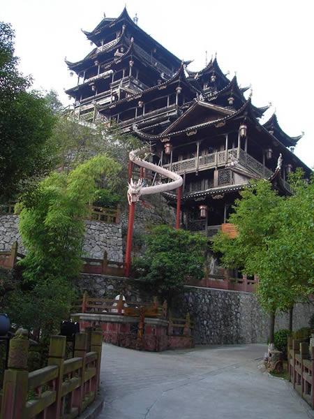 九重天 九重天世襲堂是土家風(fēng)情園的精華和靈魂所在。該建筑由土家民間藝人李宏進(jìn)設(shè)計(jì),依80度陡坡而建,高48米,共9重12層,整個(gè)樓房全部用木栓連接,沒(méi)有一顆鐵釘,堪稱(chēng)土家族建筑史上的奇跡。2002年9 月22日,九重天吊腳樓被載入世界吉尼斯世界紀(jì)錄,認(rèn)定其為目前中國(guó)最大、最高、最完美的木質(zhì)結(jié)構(gòu)吊腳樓。2001年4月6日,朱镕基總理視察土家風(fēng)情園時(shí),對(duì)九重天贊不絕口:“一批民間匠人能造出這樣輝煌的吊腳樓,而且還解決了力學(xué)的問(wèn)題,真是不簡(jiǎn)單!鼻迦A大學(xué)著名建筑學(xué)家何重義先生說(shuō):“張家界土家風(fēng)情園完全可以和蘇州的園林相媲美。特別是九重天世襲堂,猶如玉宇瓊閣,令人神往!”古人說(shuō),天有九野,地有九州,土有九山,山有九寨。古人又把九重叫做天,說(shuō)天有九重,最上一重是上帝和君主居住的地方,所以我們叫它“九重天”。