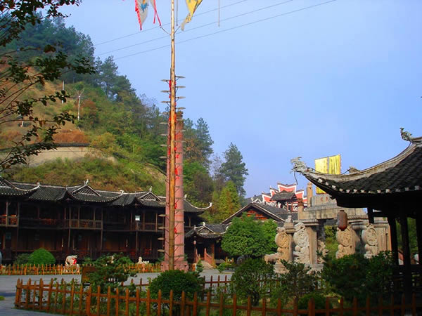 土司城 土司制度初建于五代十國(guó)時(shí)期,到了明朝己非常成熟了,土司王有無(wú)上的權(quán)威,在湘西有三大土司王分別是桑植土司向氏、永順土司王彭氏、慈利土司王張氏,其中又以永順溪州土司彭氏實(shí)力最強(qiáng)。其它土司王都為自己修建一座土司城,唯有彭氏分別在永定、永順修建了二座土司城。在永定的土司城內(nèi),彭氏為顯示其地位,修建了湘西最高的一座高達(dá) 48米,共12層的吊腳樓,整棟樓竟無(wú)一根鐵釘,堪稱(chēng)土家吊腳樓建筑史上的奇跡,此樓于2002年9月被評(píng)為最高吊腳樓,榮獲世界吉尼斯之最,與此同時(shí)土司城內(nèi)舉辦一千人參加表演的毛古斯舞蹈活動(dòng)獲得圓滿(mǎn)成功,同時(shí)獲得世界吉尼斯之最。進(jìn)入土司城,首先看到土司城迎賓儀式,土家漢子迎賓鼓,吹牛角、放沖,土家姑娘攔門(mén)歌,敬攔門(mén)酒,進(jìn)入城內(nèi),在祭祀堂前舉行百人土家大祭祖活動(dòng),男女老少唱擺手歌、跳擺手舞,登世界最高的吊腳樓九重天,參觀土家族千百年來(lái)文化展示。到土家山寨,聽(tīng)土家歌,賞土家族最有代表風(fēng)俗哭嫁,三棒鼓,花燈等民俗表演。