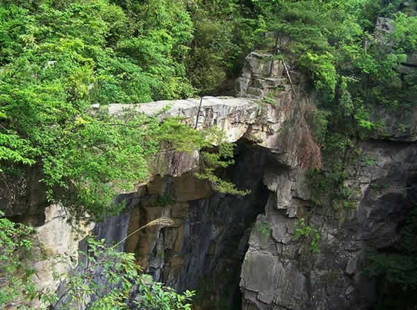 仙人橋又稱(chēng)天下第一橋,坐落在猴子坡上、天子峰下的王爺洞對(duì)面。橋?qū)僮匀恍纬,長(zhǎng)26米,寬1.5米,厚一米多,高約六七十 米,飛架在兩岸懸崖絕壁之上,鬼斧神工,惟妙惟肖,古人云:“天地可掬,此真天造也”。仙人橋?yàn)榧t砂巖結(jié)構(gòu),兩端生有高大的黃山松和杜鵑樹(shù),濃蔭掩映,極其美麗。橋的東頭還有自然形成的石級(jí),人可順石級(jí)而下,走上天橋,下視萬(wàn)丈深淵,令人頭暈?zāi)垦,非健壯者不敢逾越,旅游者無(wú)不贊嘆,說(shuō)它是“天下絕景”。