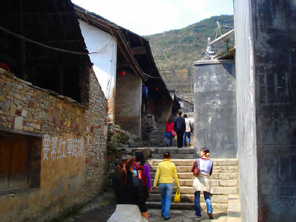 苦竹寨 賀龍?jiān)谏V哺锩鼤r(shí)期,幾乎踏遍了澧水兩岸的山山水水,村村寨寨。苦竹寨是澧水邊的一座少數(shù)民族雜居的村落,保留了明清時(shí)的建筑特色,民風(fēng)淳樸,村民能歌善舞,許多桑植民歌都是靠苦竹寨的歌手流傳的。入夜的時(shí)候,苦竹寨亮起了盞盞紅燈,這是村里的一個(gè)傳統(tǒng)。當(dāng)年紅軍夜行軍過苦竹寨的時(shí)候,村里有個(gè)老婆婆怕紅軍夜黑路難走,便在家門口懸起了一盞紅燈,其它村民爭(zhēng)相效仿,苦竹寨成了一個(gè)燈的世界。這段軍民魚水情被寫成了歌,傳唱到現(xiàn)在,這就是《門前掛盞燈》。