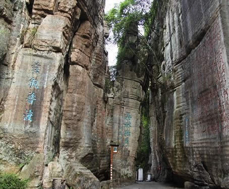 不二門 不二門風景區(qū)是一座國家級森林公園(二00六年八月三十一日,經(jīng)國家林業(yè)局批準,成為首批獲得中國國家森林公園專用標志使用授權(quán)的國家級森林公園),湖南省有名勝景。風景區(qū)位于縣城南1.5公里的猛洞河畔,總面積達30平方公里,是猛洞河風景區(qū)的北大門。以石奇、溫泉、石刻、觀音朝拜為其特色。石灰?guī)r溶蝕而成的不二石門、蓮花池、八陣圖被視為大自然的鬼斧神工。 一筆呵成的"山青海岸"四個字合成一個"岸"字的石刻、有迷魂鎮(zhèn)之稱的八陣圖令人驚嘆不已。這里一年四季蒼翠蔥蘢,梵聲繚繞,是修身養(yǎng)性的好地方!稙觚埳浇朔擞洝、與《相西剿匪記》均在此拍攝。 不二門取自佛家“不二法門”之意,正門的右壁上有沈從文先生題寫的“石門天鑿”四字,為沈先生生前最后一次回鄉(xiāng)時題寫。