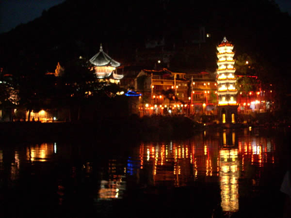 萬名塔 夜景 歷史沿革 萬名塔位于沱江沙灣北岸,與遐昌閣、虹橋相映。集中焚毀廢舊字紙的所在,三層,已毀。八十年代黃永玉召集當(dāng)?shù)厝四季柚匦逓槠邔,得到縣人民政府和各界人士的響應(yīng),并積極贊助資金,因捐款者甚眾,名為萬名塔。1988年10月建成,耗資5900元。塔內(nèi)外都添設(shè)了燈光,到夜間一片通明,和河兩岸一色的紅燈籠很相稱。塔內(nèi)壁上布滿游客題名,有的甚至位于兩米多高的墻上。 塔用青磚和混合沙漿以及鋼筋混泥土砌筑而成。塔為六方、七級(jí),每層六個(gè)翹角,精美秀麗,且懸掛銅制風(fēng)鈴。塔高22.98米,一層直徑4.5米,向上每層直徑縮小0.3米。塔面裝飾雅致,塔身挺拔秀麗,宛若少女婷婷玉立于沱江之畔。一層有楹聯(lián)六副,皆為名人所題,或頌或感,風(fēng)格各異。如原縣長(zhǎng)吳官林題聯(lián):"塔靜梧高凌空引鳳;河清岸曲流水藏蛟"。民主人士田鶴丹題聯(lián):"喜層層凌云高起;恰悠悠在水一方"。塔身映入沱江碧波之中,搖搖晃晃,顯得格外秀氣動(dòng)人。
