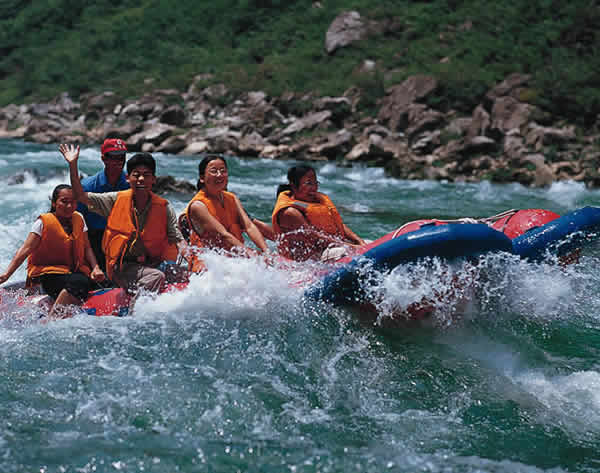 茅巖河漂流 茅巖河不僅是水的彩圖,也是山的國畫。兩岸青山綿延,萬木蔥籠,峭壁對峙,溝深谷幽,洞穴密布。刀削似的峭壁上古松斜掛。老鷹、烏鴉、黃雀成群盤旋于峰尖,嗚叫于峭壁。
