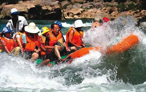 河水更為兇悍強勁,昂頭撤蹄,湍湍東去。一灘連一灘,一浪挽一浪。百里河流百里灘,百里流水百里浪。茅巖河水無情地撞擊著河中根基深厚的礁石,盡管撞擊得頭破血流,斷腸裂肺,粉身碎骨,依然無怨無悔,從不停歇地演繹著生命的壯觀。被撕碎的生命化成點點銀珠拋上天空,繼而又落回永不消逝的軀體上,織就了一幅生生不息的王母娘娘灑降甘露圖。而被河水沖撞了千百年仍然傲然屹立的礁石,撕破了河水剛剛要向人展示玉脂般的肌膚,又被洶涌而至的河水淹沒,再次擊起滿天銀花。前進與阻擋相搏發(fā)生的巨大轟鳴,在河谷里一次又一次的回響,在群山中一次又一次地震蕩。若乘坐皮筏或小舟在河上漂流,一種無以言狀的享受游走在每根神經(jīng)。人時而被軟若無骨的河水拋上浪尖,時而又被它牽扯著跌入峰谷。會不由自主地發(fā)出享受大自然賦予的刺激的無險驚叫。尖叫聲與浪濤聲匯成了一支歡樂的樂章。