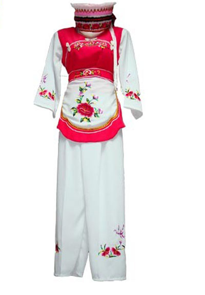 “崇尚白色”是白族人的一個明顯特點。不論男女都愛穿白色服飾,故有“要得俏,一身孝”之說,過去穿戴的白布又稱“家布機”,是白族人自己種棉花,自己紡紗,自己用土機織,用土法洗漂而成,其服飾美觀大方。一般來說,男子戴五尺、七或九尺的白布頭巾。上穿白色對襟布扣汗衣,外套青色滿肩馬褂,腰系桃花兜,并配撤穗荷包,下著青色寬腳褲,腳穿白布襪子和天官云頭鞋。婦女頭上蒙白色繡花帕,兩耳垂環(huán),手戴鐲子或戒指,外套繡花圍裙,用繡花飄帶系著,右上胸佩掛三吊或五吊銀質(zhì)牙簽。下著蘭色寬褲,腳纏白色裹腳布,穿繡花尖尖鞋。無婚女性則挽“簪巴”,挽于腦后的稱“粑粑”,挽于頭頂?shù)姆Q高把簪,簪上套有網(wǎng),橫插簪子;兒童衣服多繡花,外圍肚兜,頭戴虎頭鼓針菩薩帽,頸戴“項圈”、“百家鎖”等,手腕套有銀圈,上系小吊,吊上有錘、鈴、鞋、斧、簽等。