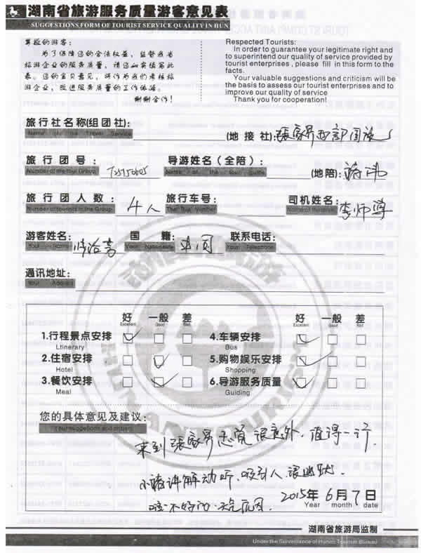 5月下旬,上海張女士一行四位貴賓與湖南西部(張家界)中國國際旅行社工作人員——龔玲取得聯(lián)系,經(jīng)過商談,雙方達(dá)成協(xié)議并簽訂旅游合同,于6月4日抵達(dá)張家界,開始張家界之旅。此次行程是由我社優(yōu)秀導(dǎo)游——褚偉,負(fù)責(zé)旅游接待工作,褚導(dǎo)在旅游過程中講解詳細(xì),客人也很滿意,在意見表上寫到:來到張家界感覺很意外,值得一行,小褚講解動聽,吸引人,很幽默!同時也感謝張女士選擇湖南西部(張家界)中國國際旅行社,以及您對湖南西部國旅的信任與支持。我們會繼續(xù)努力,做好旅游接待工作。期待下一次與您的合作,祝您愉快!
