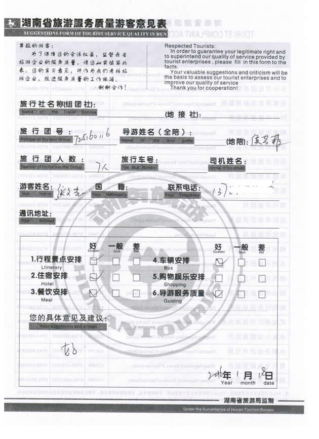 現(xiàn)在位置:首頁 -> 西部國旅->旅游質(zhì)量反饋 -> 2016-1-16 長沙張文光一行7位貴賓 天門山、黃龍洞,寶峰湖兩晚三日游
