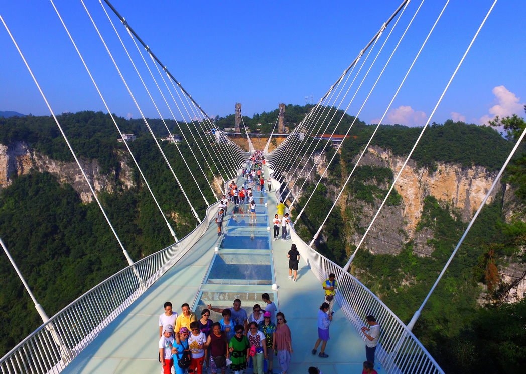 張家界大峽谷玻璃橋位于湖南省的張家界大峽谷景區(qū)栗樹埡和吳王坡區(qū)域內(nèi),為一座景觀橋梁,兼具景區(qū)行人通行、游覽、蹦極、溜索、T臺等功能。主跨430米,一跨過峽谷,橋面長375米,寬6米,橋面距谷底相對高度約300米。這座全透明玻璃橋長度、高度位居世界第一。
