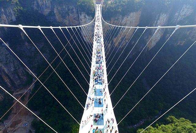張家界大峽谷玻璃橋橋面由99塊全透明玻璃鋪設,橋面總長430米、寬6米,距谷底相對高度約300米,游客走在橋上就可以清楚地看到腳下的懸崖峭壁,好似行在空中,非常刺激,被美國有線電視新聞網(wǎng)列入世界上11座最壯觀的橋之一。目前,張家界大峽谷玻璃橋已經(jīng)成為世界旅游的一張響亮名片。